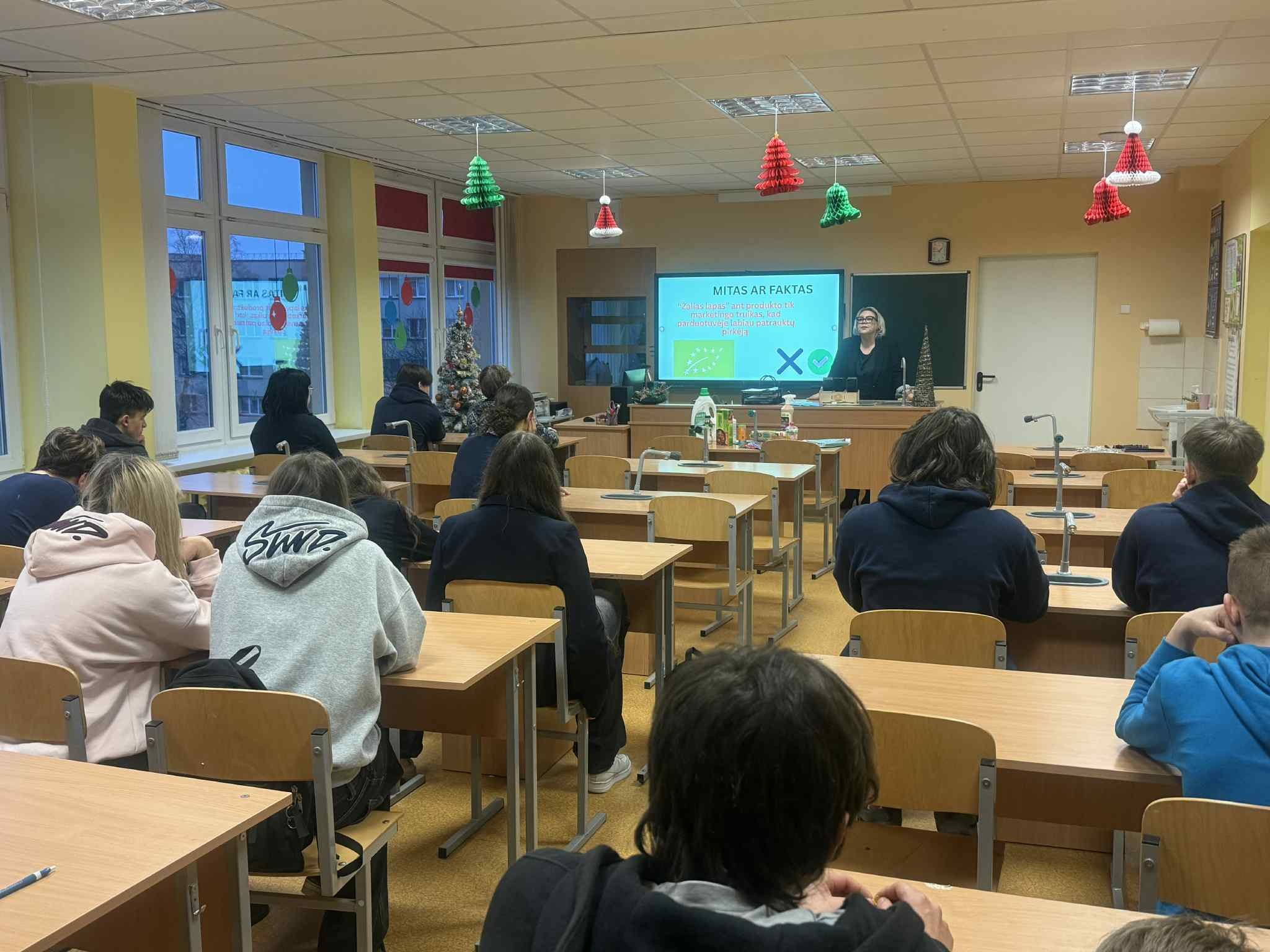 Mūsų gimnazijoje lankėsi Vilniaus Tech universiteto Aplinkos apsaugos ir vandens inžinerijos katedros skyriaus vedėja doc. dr. Aušra Zigmontienė, kuri vedė integruotą chemijos pamoką 9–10 klasių mokiniams: Eko detektyvas. Kas slypi už ženklo.