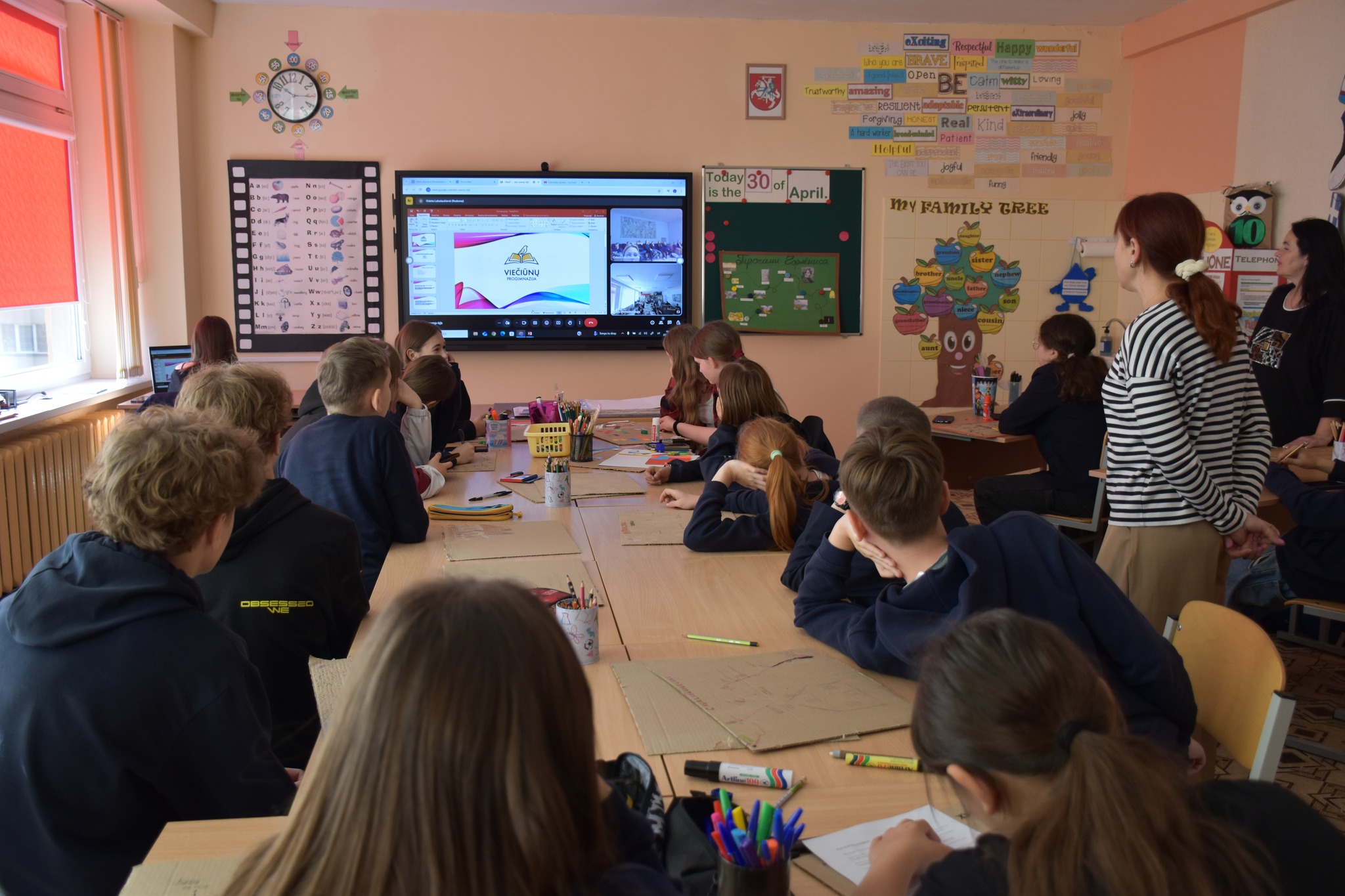 Balandžio 30 dieną gimnazijos mokiniai dalyvavo virtualiame susitikime su Viečiūnų progimnazijos mokiniais ir mokytojais. Susitikimo metu abi mokyklos pristatė savo bendruomenes, dalijosi patirtimi apie M. K. Čiurlionio asmenybę bei kūrybą. Kartu buvo kuriamas žemėlapis, žymint svarbias vietas, susijusias su menininko gyvenimu – ši veikla padėjo pasiruošti tolimesnėms pažintinėms išvykoms.